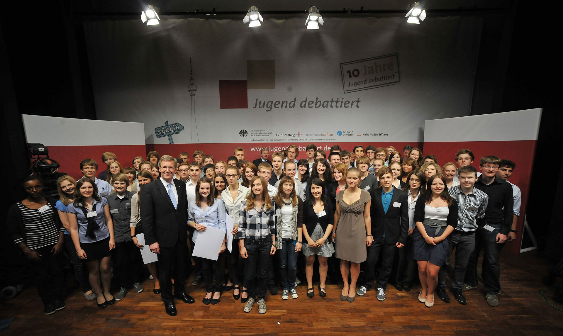10 Jahre Jugend debattiert! Das Bundesfinale 2011 wird als Jubiläumsfinale in Anwesenheit von Bundespräsident Christian Wulff und zahlreichen Ehrengästen im Auswärtigen Amt gefeiert. Erstmals können alle Fans die Veranstaltung auf Youtube mitverfolgen.